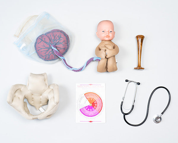 Zu unserem Set gehört außerdem ein Hörrohr sowie ein Stethoskop um matale sowie fetale Herzschläge abzuhören, sowie zu lernen hier auch Unregelmäßigkeiten wahrzunehmen. Eine Schwangerschaftsberechnungscheibe hilft dabei den Geburtstermin zu berechnen und erklärt übersichtlich die Phasen einer Schwangerschaft inklusive der Veränderungen bei Mutter und Kind zu lernen.